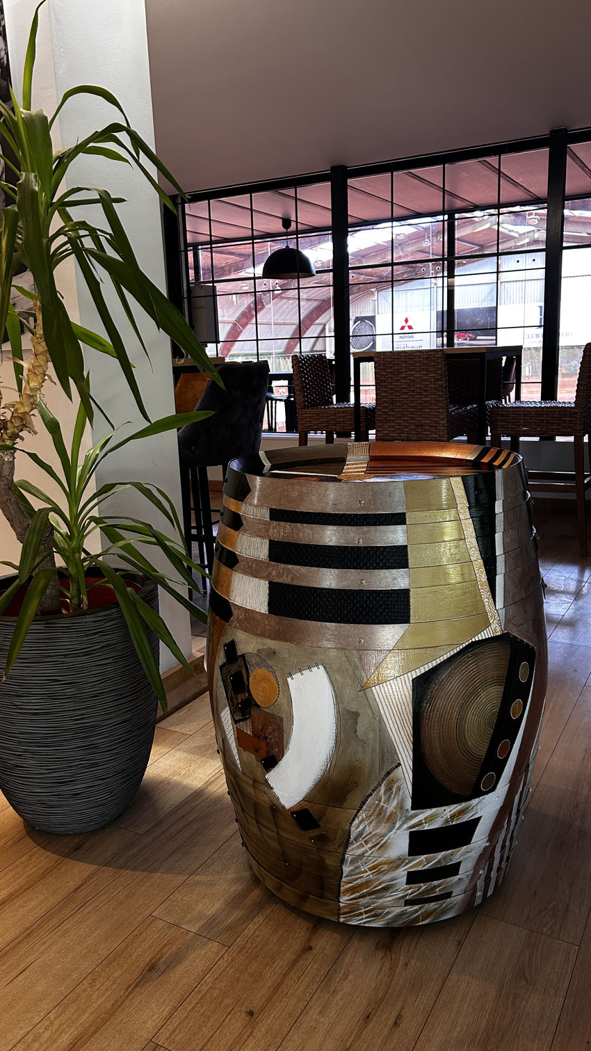 Anciennes barriques de vignerons travaillées à l’acrylique et enrichies de matière, elles se transforment en pièces uniques, où chaque détail raconte une histoire.